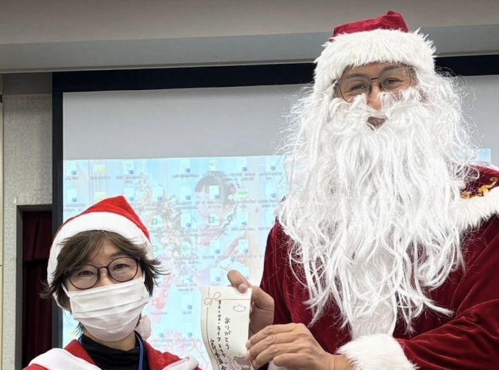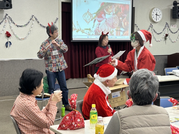 二部のクリスマス会では、スタッフ夫妻による素敵な音楽のプレゼントに始まり、コーヒー好きのスタッフが淹れた美味しいコーヒー、手作りのスイーツやお赤飯が配られ、サンタクロースの絵本朗読、恒例のサンタによるプレゼントもあり、最後に「きよしこの夜」を歌って今年のカフェを締めくくりました。